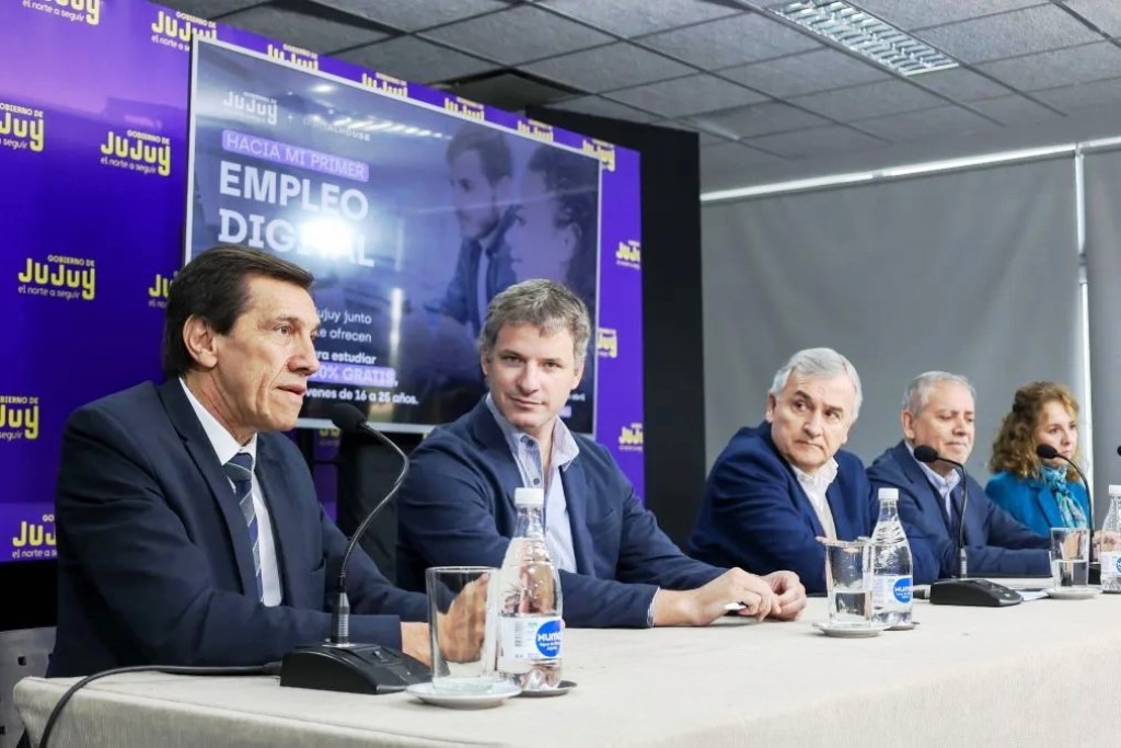 El gobernador, Gerardo Morales junto a los ministros de Hacienda, Carlos Sadir; de Desarrollo Económico y Producción, Juan Carlos Abud y de Educación, María Teresa Bovi, presentaron el programa “Hacia mi Primer Empleo Digital”, instancia de formación en Programación Web Full Stack destinada a estudiantes de 16 a 25 años de los últimos años de la Educación Secundaria Orientada o jóvenes que se encuentren cursando tecnicaturas superiores o profesorados en Institutos de Educación Superior (IES) de gestión Estatal de la Provincia de Jujuy.