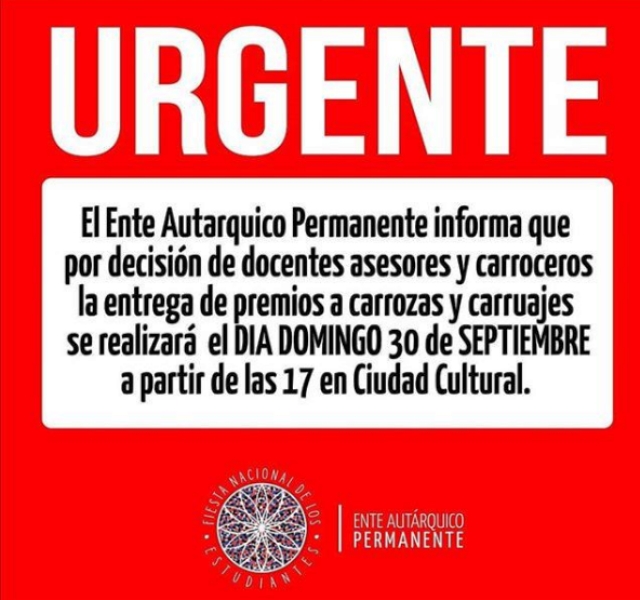 Confirmaron además, que el domingo, cuando se realice la entrega de premios, el evento comenzará a las 17 para poder terminar en un horario que permita el regreso de todas las personas que asistan a sus hogares.