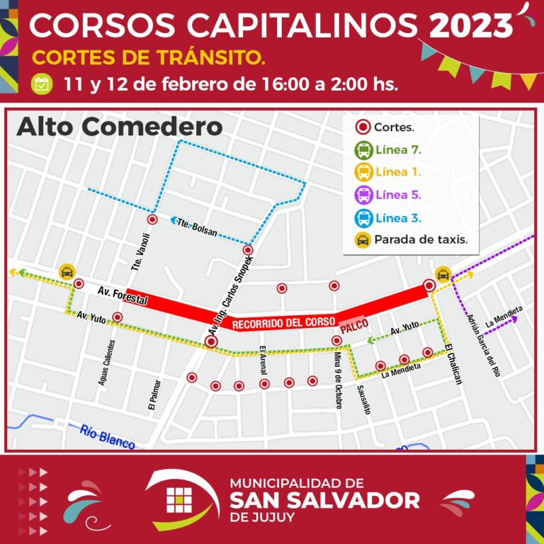 La Secretaría de Servicios Públicos a través de la Dirección de Tránsito y Transporte, dio a conocer el dispositivo de circulación paras las unidades de los servicios del transporte urbano de pasajeros (colectivos) y los cortes de tránsito en el sector para el sábado 11 y domingo 12 de febrero a partir de las 16 horas, con motivo de realizarse los Corsos Capitalinos 2023 en avenida Forestal de Alto Comedero.