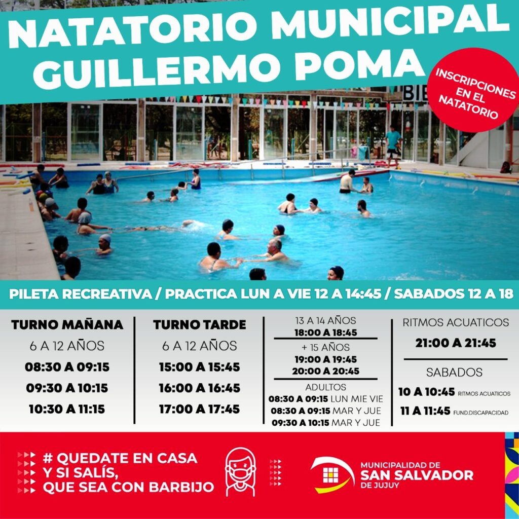 La pileta del natatorio municipal “Guillermo Poma” funciona todo el año gracias a que esta climatizada, y luego de que se reanudara su funcionamiento se agregaron dos turnos a la mañana para adultos en los horarios de las 8.30 y 9.30, de lunes a viernes, y los sábados a las 10 las clases de Aquagym, pileta recreativa y pileta libre, entre las 12 y las 15.