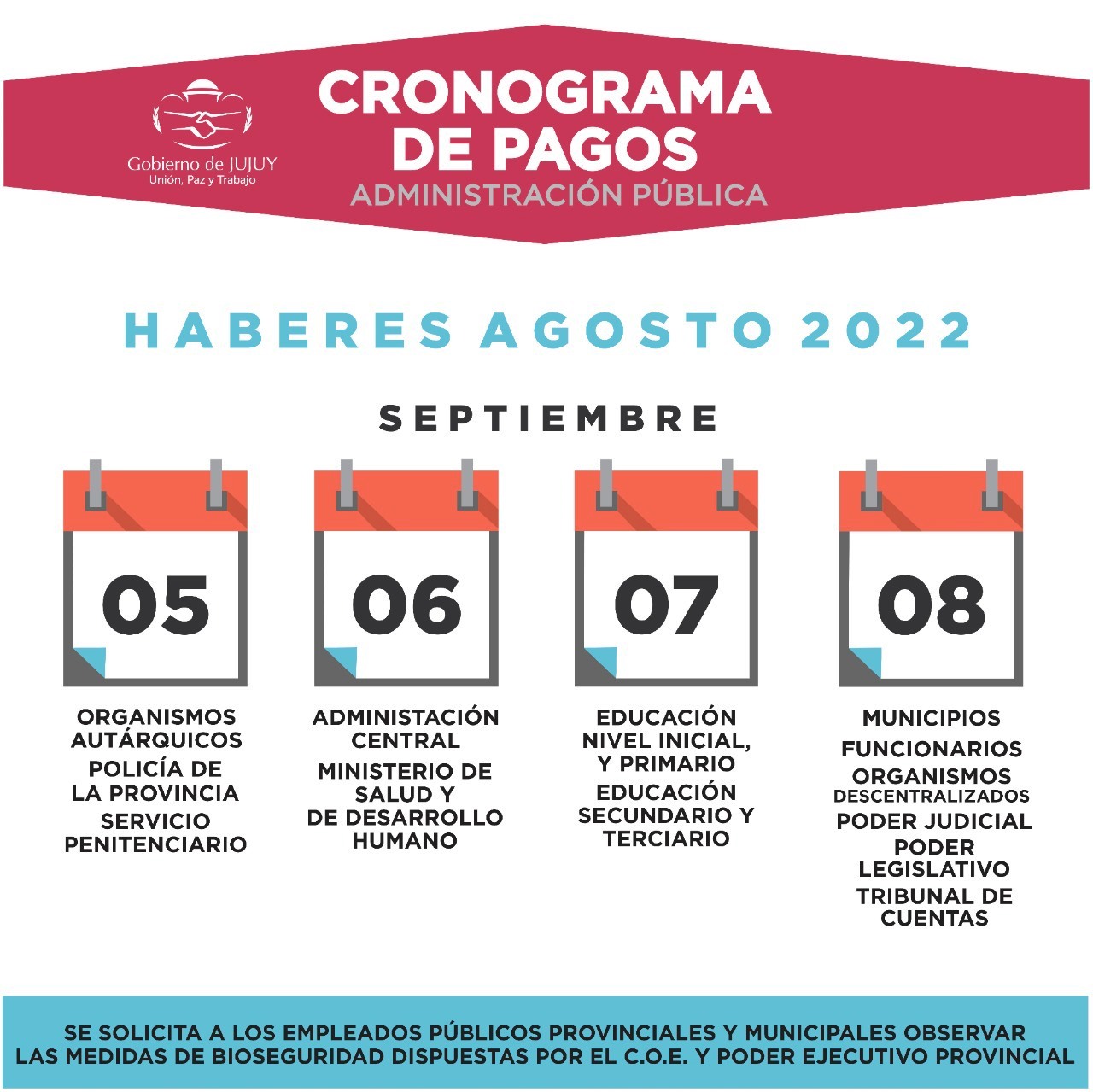 Finalmente, el 8 de septiembre, cobrarán los trabajadores de municipios, funcionarios, Organismos Descentralizados, los poderes Judiciales y Legislativo y Tribunal de Cuentas.