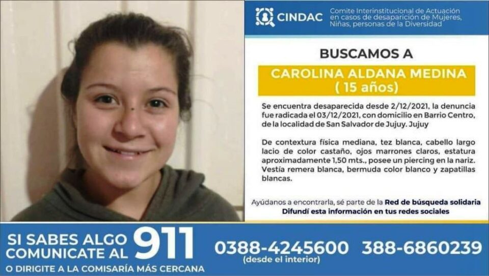 El Comité Interinstitucional de Actuación en Casos de Desaparición de Mujeres, Niñas y Personas de la Diversidad (CINDAC), el Juzgado de Menores, el Ministerio Público de la Acusación y las carteras de Seguridad y de Salud, articulan esfuerzos para dar con el paradero de Carolina Medina y Alexis Daniel Carrasco. La totalidad de los organismos del Gobierno de la provincia, están afectados y movilizados con todos sus recursos disponibles en la búsqueda de las personas citadas.