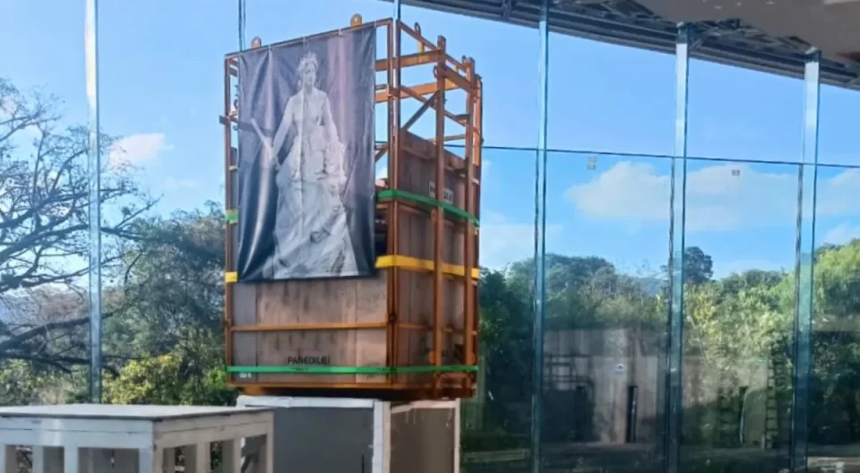 El trabajo de esta jornada empezó cerca de las 8 de la mañana, ya con el embalaje realizado previamente, que consistente en una jaula metálica, luego la colocación de fenólicos y, tras eso, la anexión de espumas de poliuretano que envolvieron a la escultura, informó Tejeda, señalando que eso garantiza que no haya movimientos ni vibraciones que puedan afectar la estructura de las esculturas durante su desplazamiento.