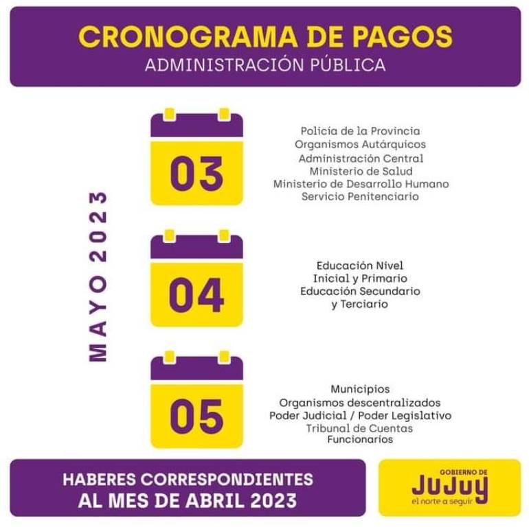 El miércoles 3 inicia el cronograma de salarios estatales 28 abril, 202328 abril, 2023 Facebook Twitter WhatsAppTesorería de la provincia anunció el inicio del cronograma de salarios para los trabajadores de la administración pública jujeña, que comenzará el miércoles 3 y se extenderá hasta el viernes 5. El cronograma es el siguiente: Facebook Twitter WhatsApp