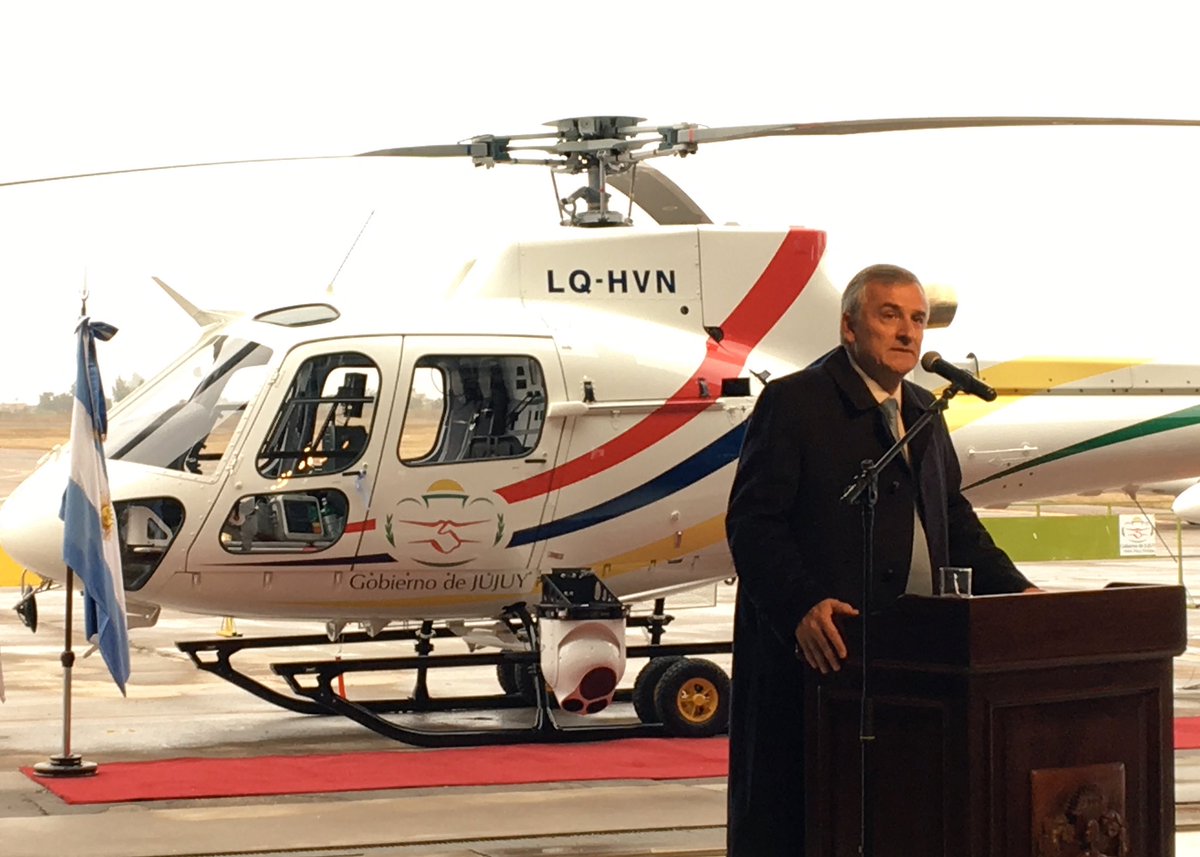 El gobernador de la provincia, Gerardo Morales, presentó hoy un nuevo helicóptero propiedad de la provincia, que tendrá como finalidad ser usado para rescates, combatir incendios y seguridad, por su parte el gobernador destacó:»Jujuy no podía no tener un helicóptero, una vida que se salve justifica la inversión”.