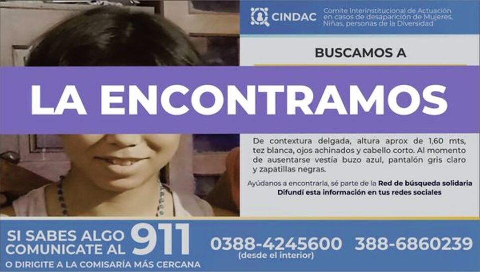 El Comité Interinstitucional de Actuación en Casos de Desaparición de Mujeres, Niñas y Personas de la Diversidad (CINDAC), informó que hallaron a Florencia Dionicio Escalera de 13 años que se encontraba desaparecida desde esta madrugada, fue hallada sana y salva y en buenas condiciones de salud.
