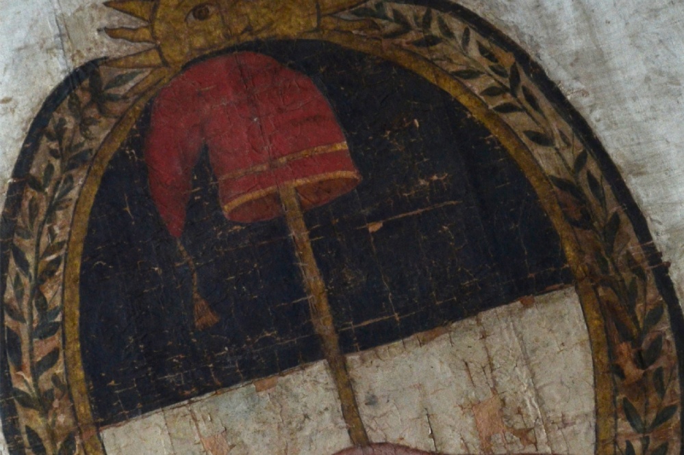 Este se encontraba adherido un bastidor de ambos frentes, aparentemente de la misma época de que se montaron en el mueble de la bandera.