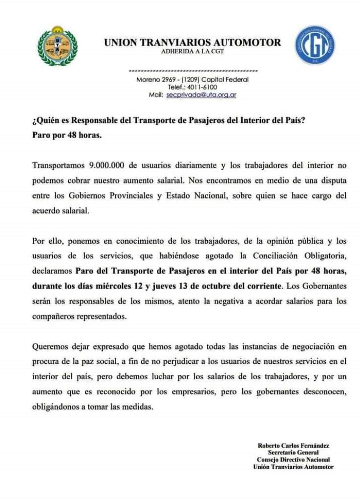 También sostuvo que el gremio agotó todas “las instancias de negociación en procura de mantener la paz social y para no perjudicar a los usuarios del interior del país”, aunque ratificó “el plan de lucha salarial en defensa de un aumento que ya reconocieron los propios empresarios de la actividad y que ahora desconocen los gobernantes”
