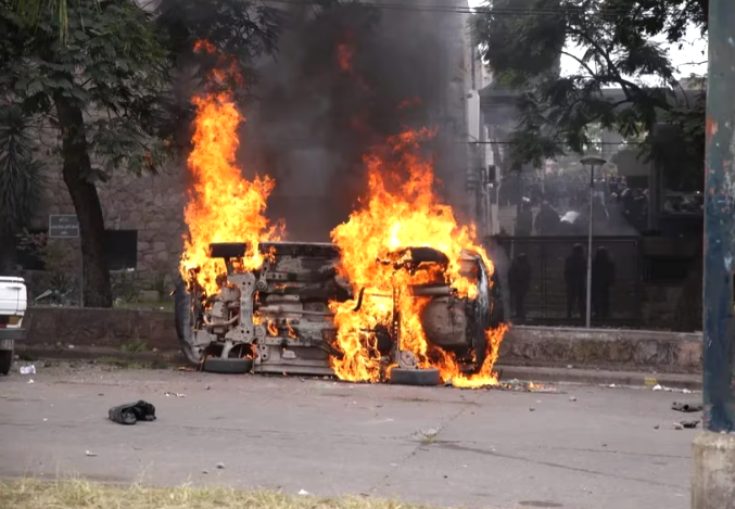 Estas personas rompieron vidrios y avanzaron sobre el edificio, prendieron fuego elementos y los arrojaron al interior del edificio, además, algunos dieron vuelta autos que se encontraban cerca del lugar y prendieron fuego otros.